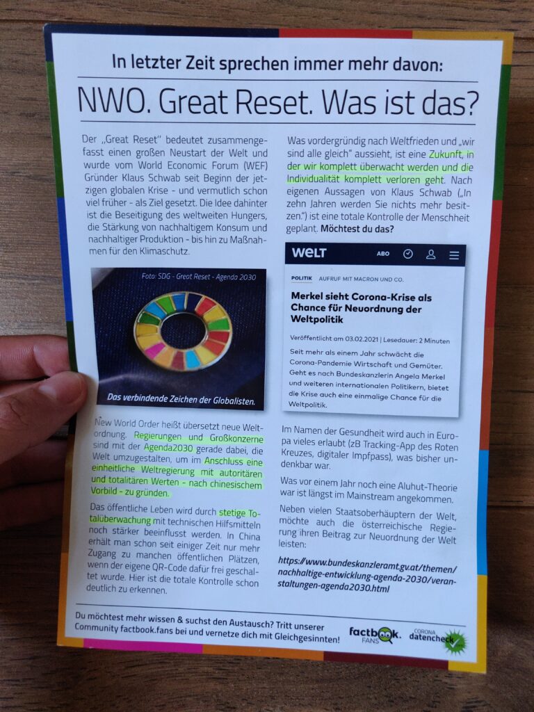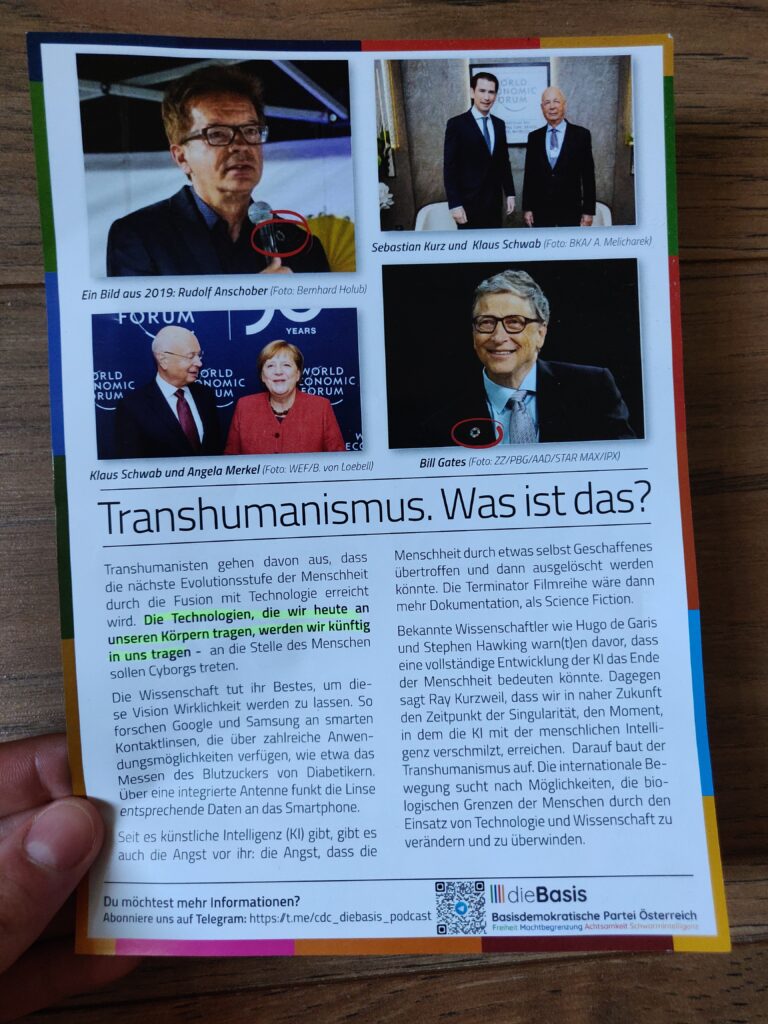 Durch das Verteilen von Flyern und in den sozialen Netzwerken möchte die Basisdemokratische Partei Österreich auf sich aufmerksam machen. Auf diesen warnen sie unter anderem vor vielen bekannten Verschwörungstheorien und hinterfragen das derzeitige politische System kritisch. Auf dem Werbeflyer der Basisdemokratischen Partei wird neben der bekannten Great-Reset-Verschwörung, auch über Transhumanismus gewarnt, mit der Annahme, dass die Menschheit von Cyborgs ersetzt werden soll.